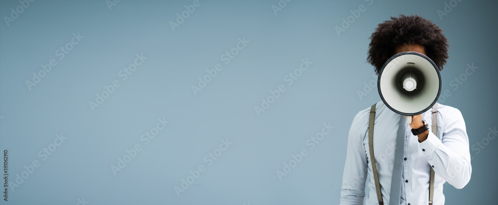 Vászonkép Attention Megaphone Shout. Man Holding Loudspeaker