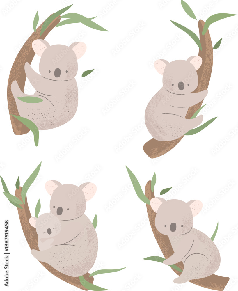 Fényképezés Cute koalas are sitting on a tree with leaves