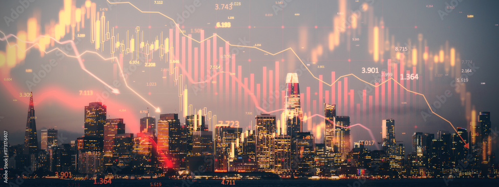 Vászonkép Double exposure of San Francisco skyline and financial stock market chart with red downward trend, glowing data points, and buildings
