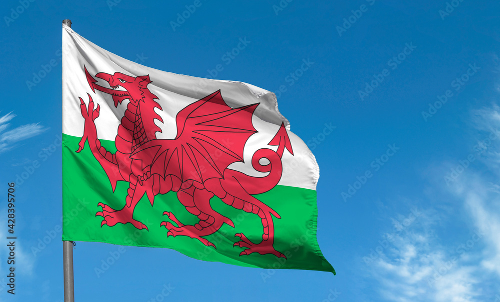 Fényképezés Flag of Wales with red dragon waving against blue sky, Cardiff