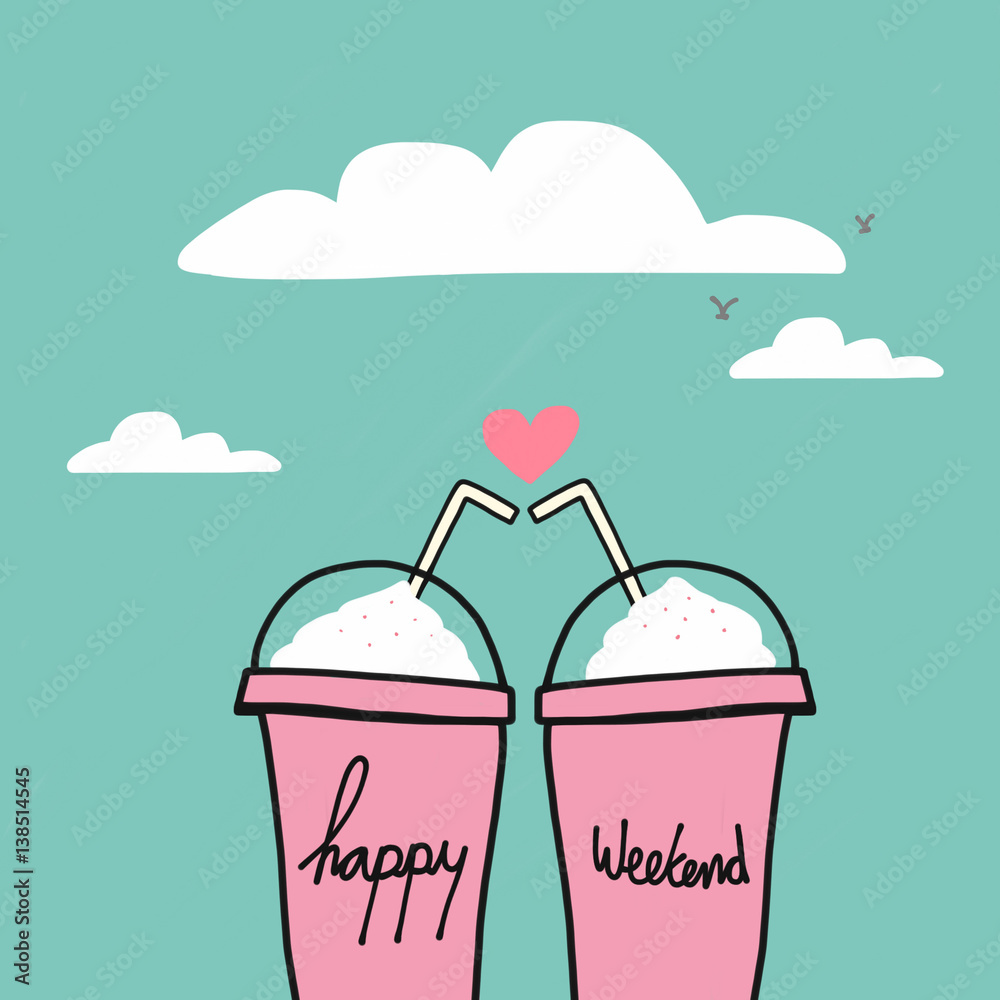 Fototapeta Happy weekend word on couple drink pink cups watercolor illustration on blue sky