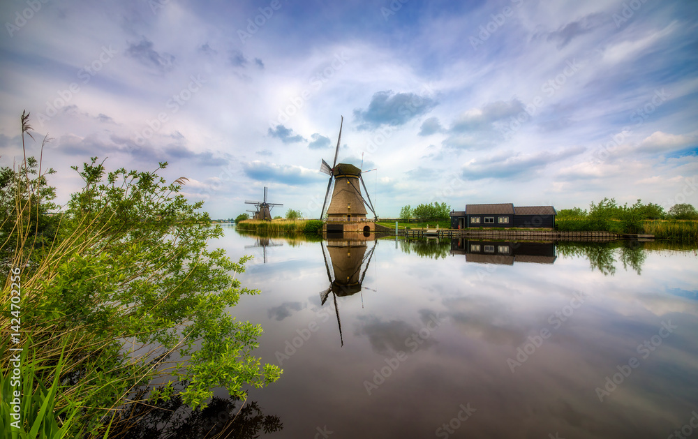 Fototapeta Canal and Old, Charming Windmills Reflecting in the Water in Kinderdijk, Netherl