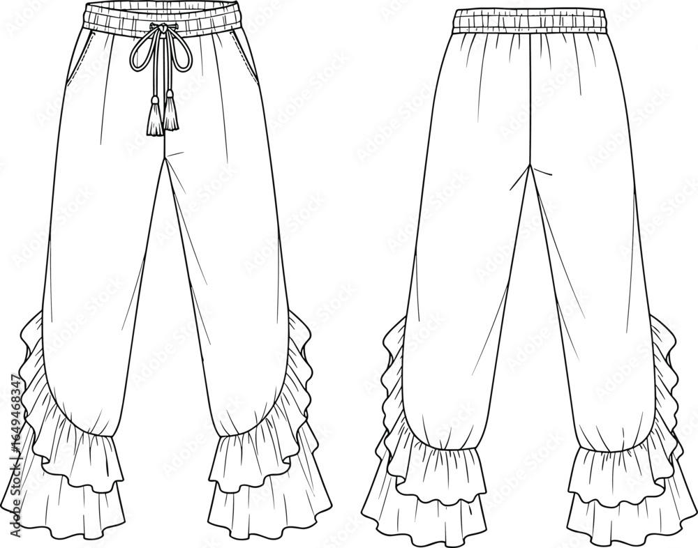 Fototapeta Fashion CAD drawing, ruffle hem pants, trendy trousers, stylish women's wear, dr