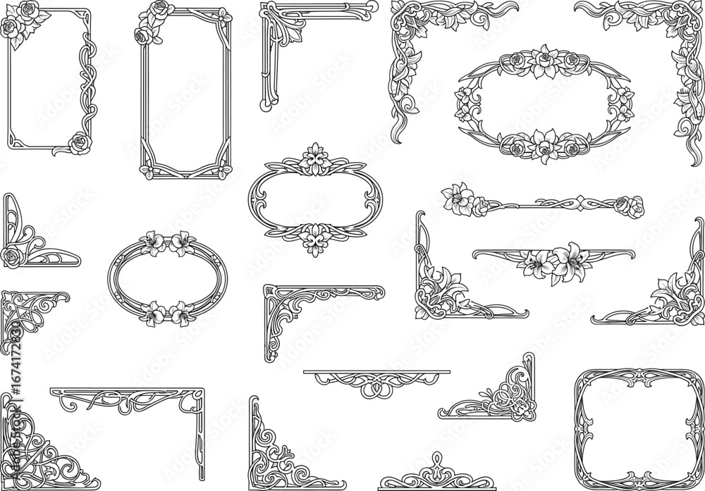 Fototapeta Elegant vintage floral corner frames and decorative border elements with intricate line art, perfect for invitations, certificates, and classic design projects