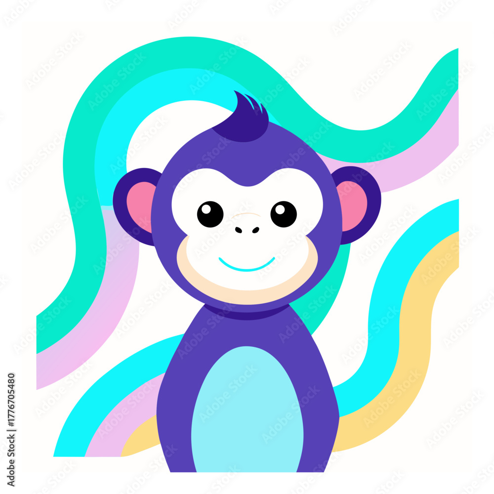 Fototapeta Cute purple cartoon monkey with a playful expression and colorful wavy lines beh