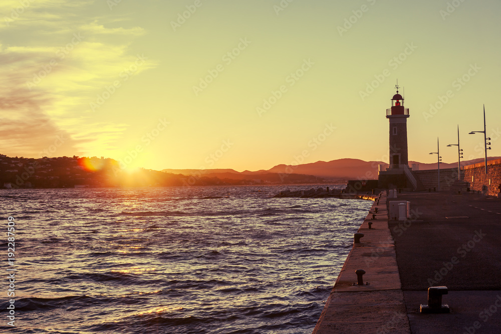 Fototapeta Bright beautiful colorful sunset, Lighthouse in Saint Tropez, France, Cote d Azu