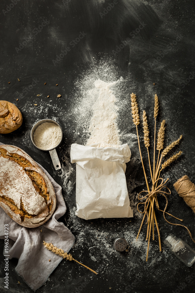 Fototapeta Bread, flour bag, wheat and measuring cup on black - kitchen