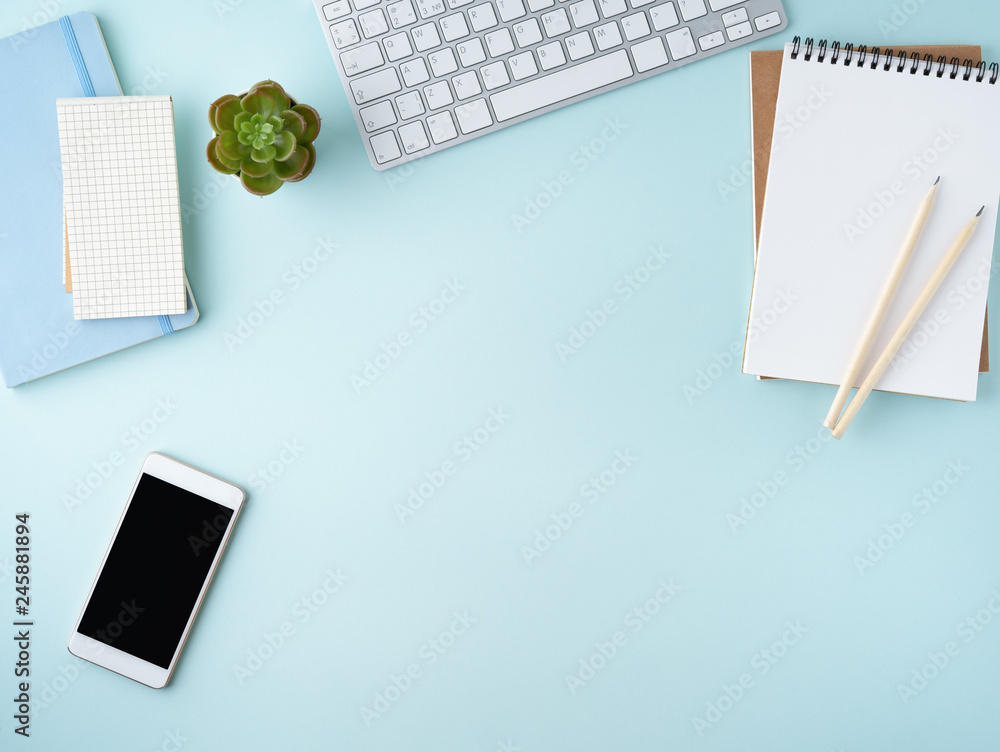 Fototapeta Top view of modern blue office desktop with blank notepad, computer, smartphone
