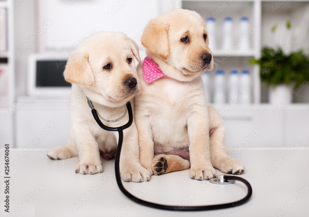 Fototapeta Two cute labrador puppy dogs sit on examination table at the veterinary doctor o