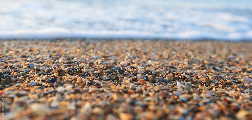 Fototapeta small colored shells and sea sand on the seafront in the east sun