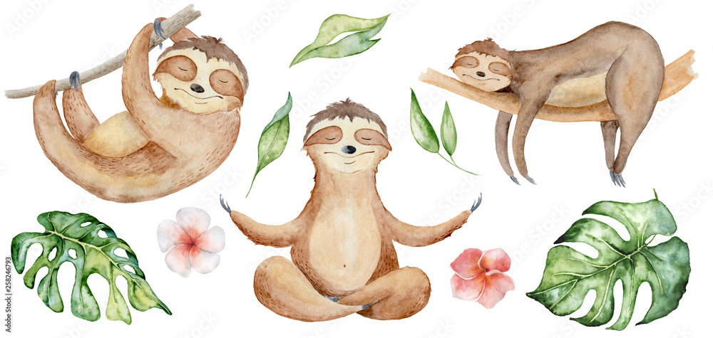 Fototapeta Sloth bears watercolor set hand drawn illustration with tropical leaves