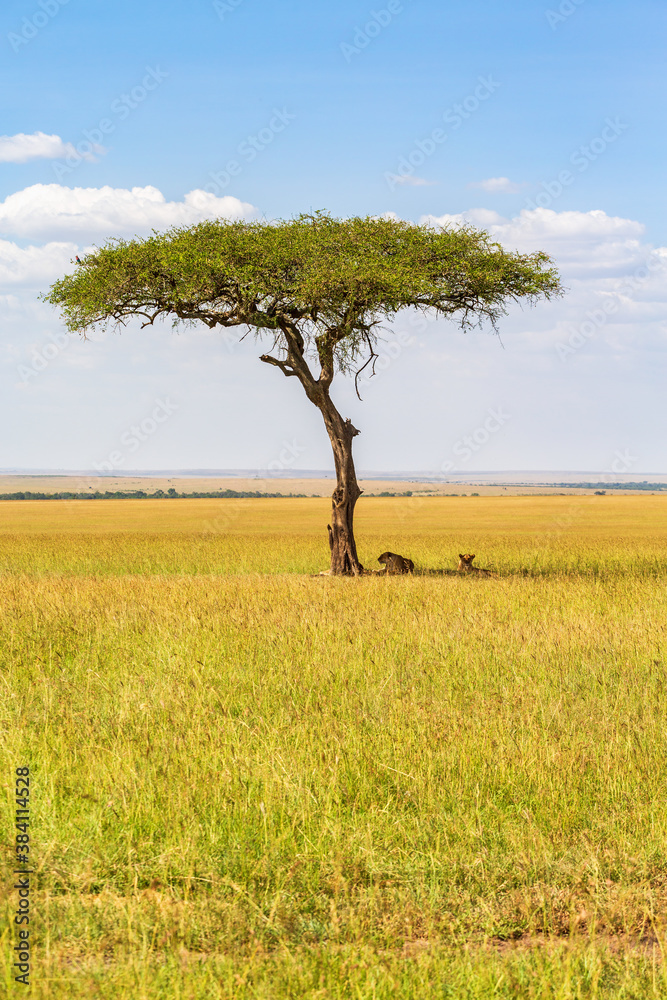 Fototapeta Single Acacia tree and resting lions at the savanna in Masai Mara