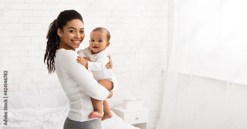 Fototapeta Young Black Mom Holding Baby Toddler Posing Standing Indoors, Panorama