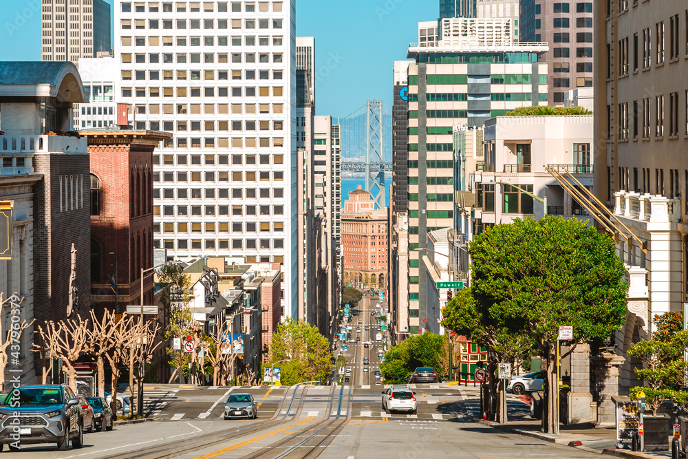 Fototapeta A street in the center of the city with a sloping road and a beautiful view of the downtown