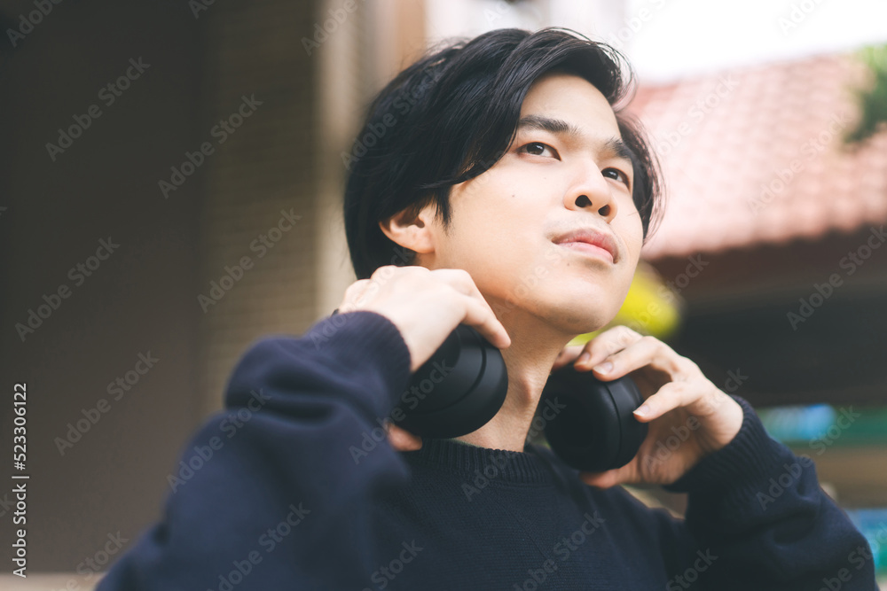 Fototapeta Portrait of young adult asian men with black short hair using headphone listen m
