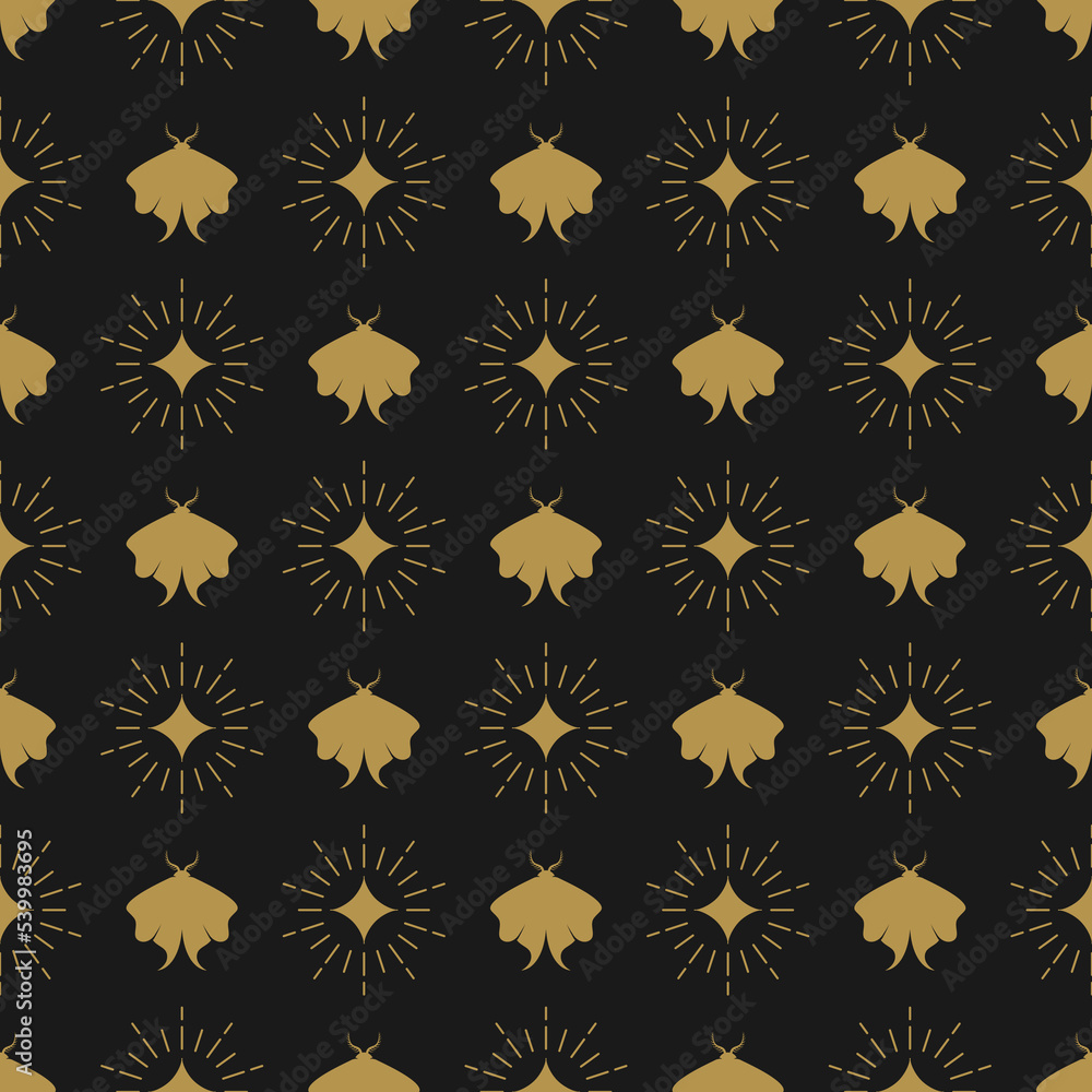 Fototapeta Seamless pattern with golden shining sparkles and mysterious moth on black background