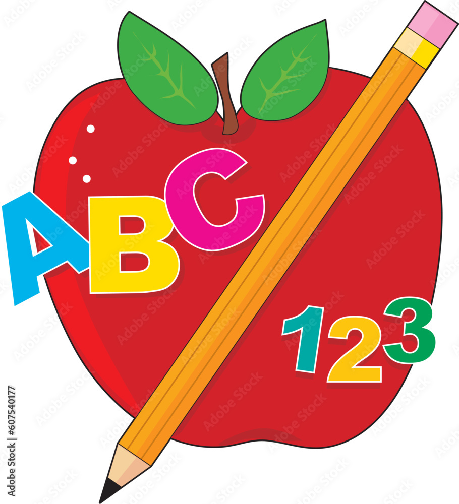Fototapeta A red apple with a pencil ,the alphabet and numbers