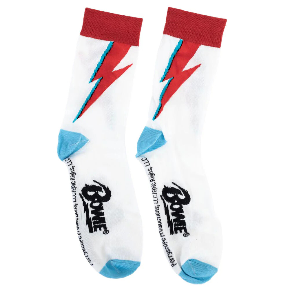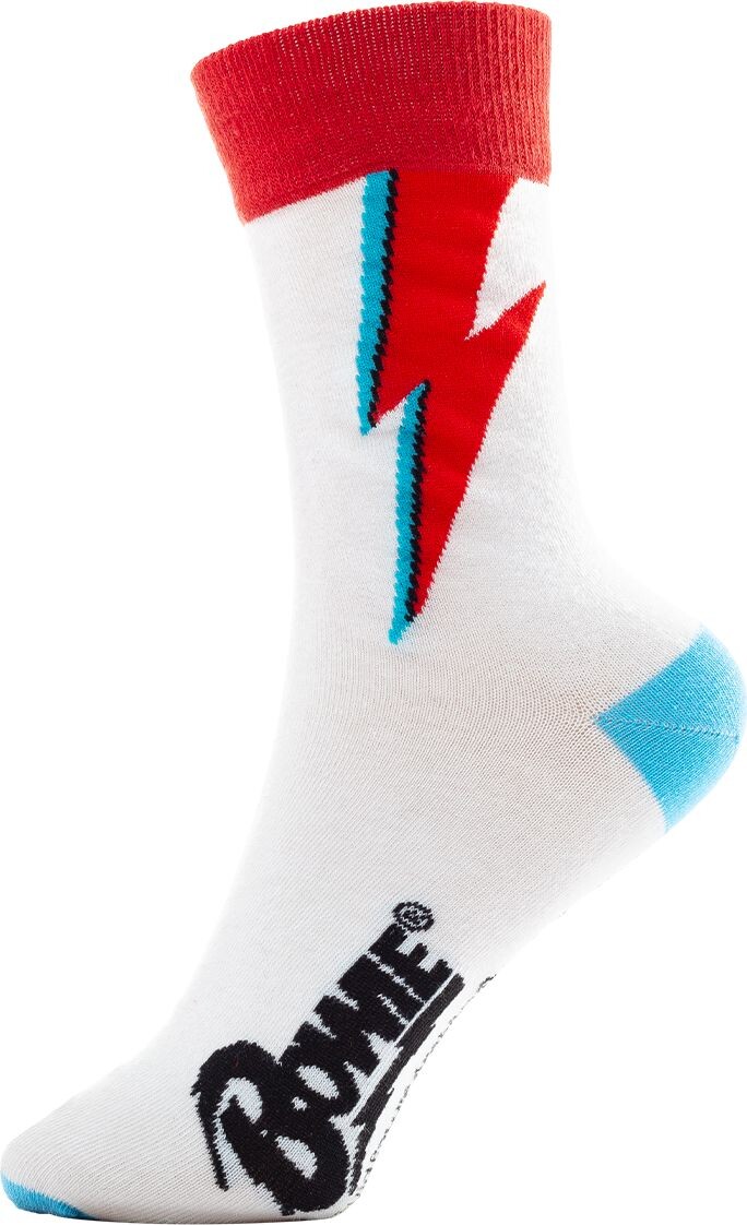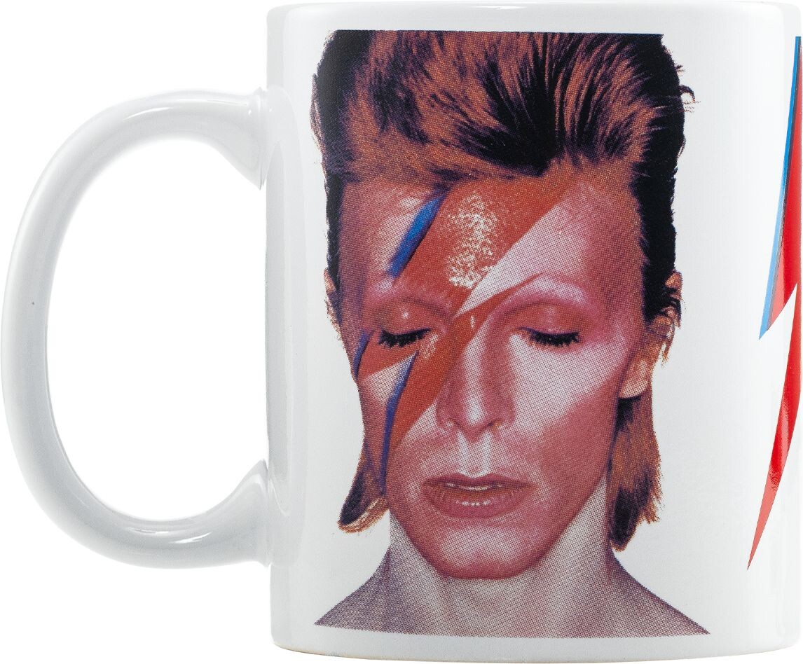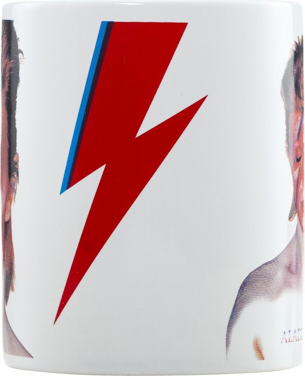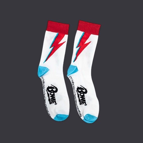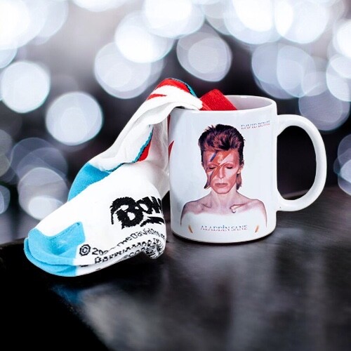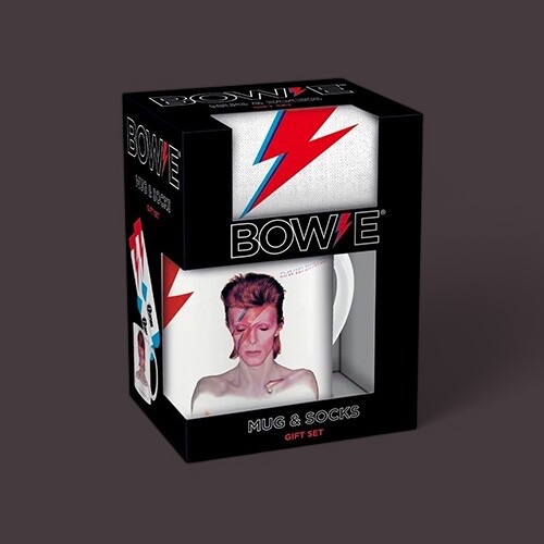A David Bowie rock ajándékcsomag az ikonikus Aladdin Sane villám motívummal egy 315 ml-es kerámia bögrét és kényelmes zoknit tartalmaz 41-45 méretben.