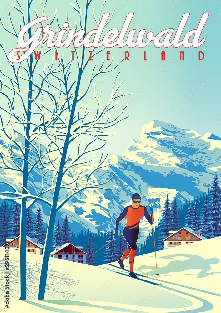 Fényképezés Grindelwald Travel Poster with with skier int the first plan, houses, forest and