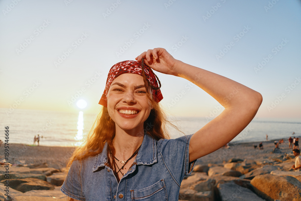 Fényképezés smiling woman wearing denim jacket and red bandana on beach during sunset, boho-