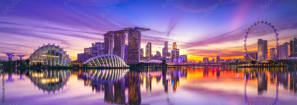Fényképezés View of the skyline at the Downtown Core along Marina Bay at dusk in Singapore
