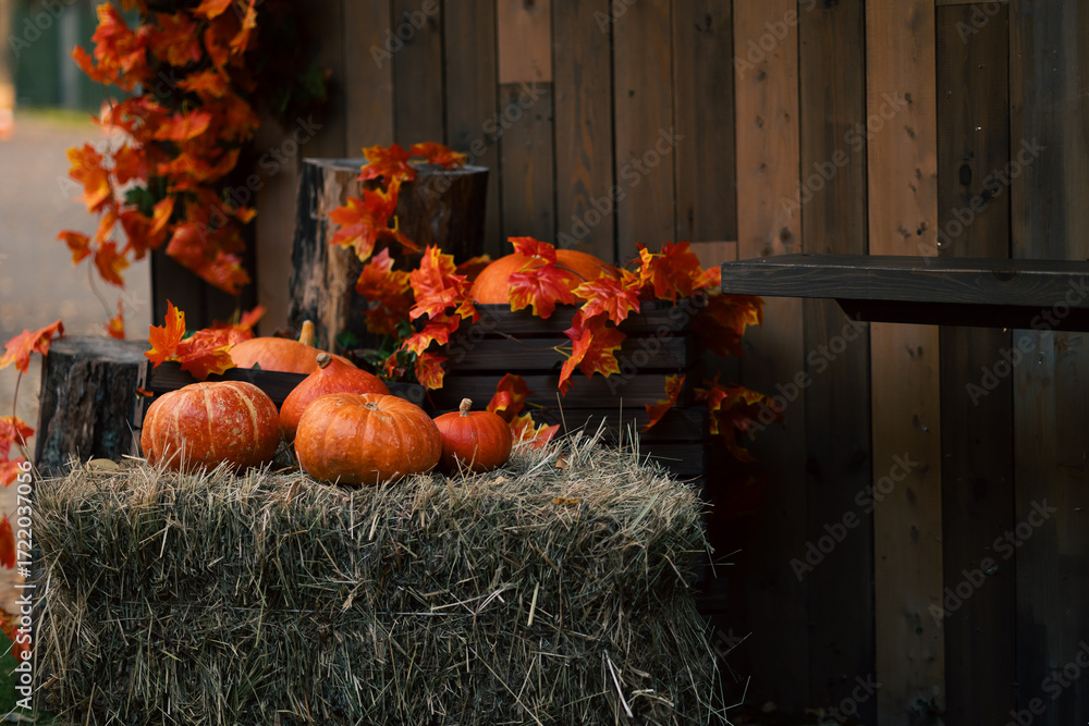 Fényképezés Embrace autumn with charming harvest decor of pumpkins and colorful foliage for