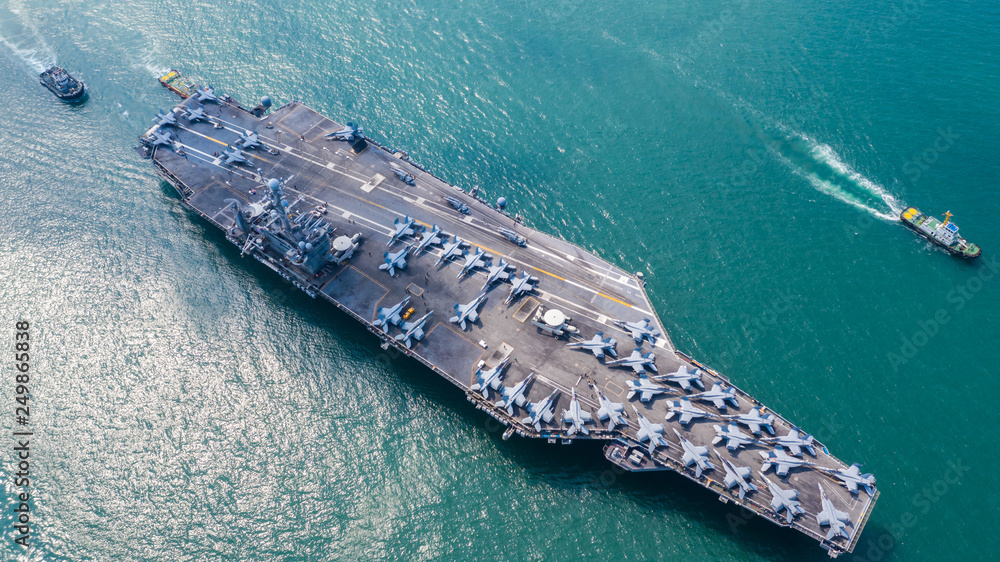 Fényképezés American navy nuclear aircraft carrier, USA military navy ship carrier full loading fighter jet aircraft, Aerial view