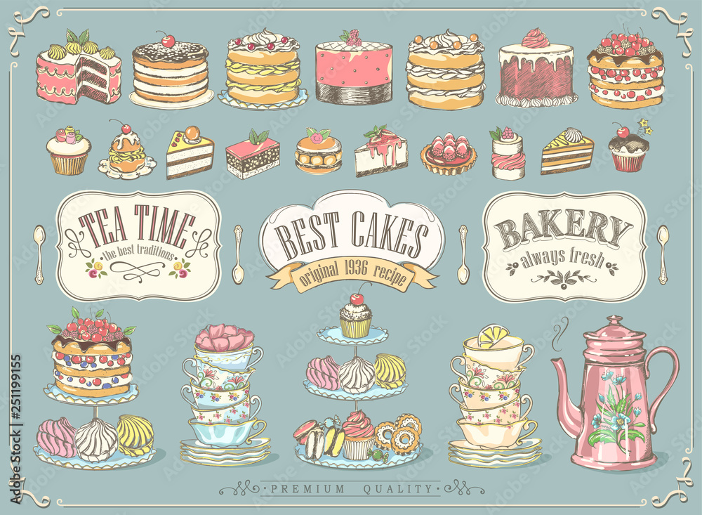Fényképezés Big vintage collection of hand-drawn tea and kb bakery