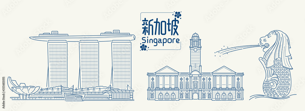 Fényképezés Building Line art Vector Illustration design - Singapore, South Korea, Chinese t