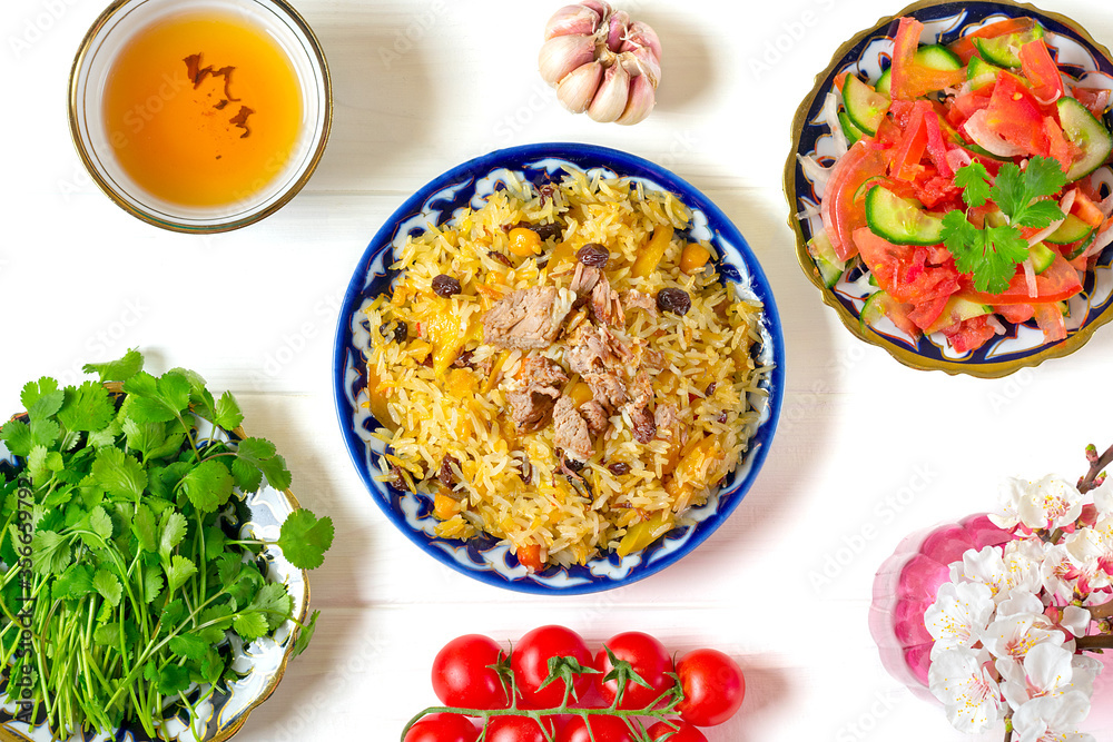 Fényképezés National Uzbek pilaf with meat, achichuk salad of tomato, cucumber, onion in pla