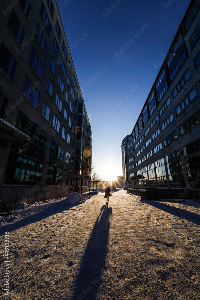 Fényképezés Stockholm, Sweden Pedestrians in the Marievik neghborhood in the early morning winter sun