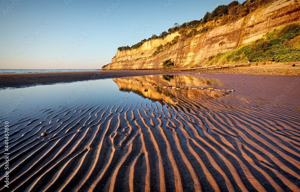 Fényképezés Shanklin beach on the isle of wight, with ripples in the sand and reflection of cliffs in the pool of water