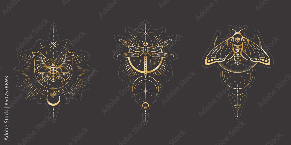 Fényképezés Vector mystic celestial sticker set a with golden outline insects, stars, crescents and moon phases