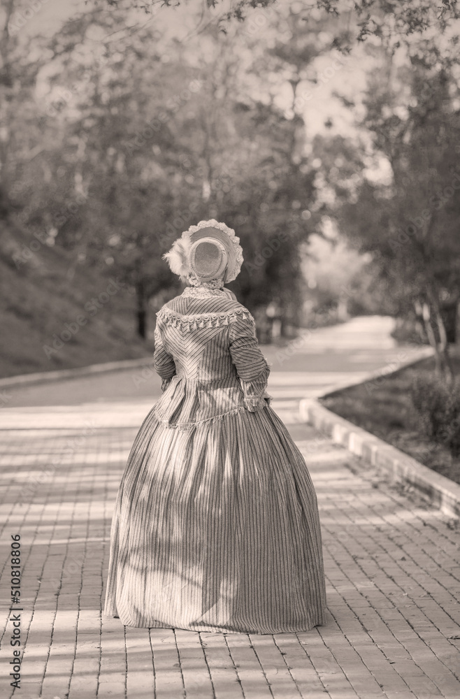 Fényképezés Woman in victorian dress walking in the park. Vintage fashion.