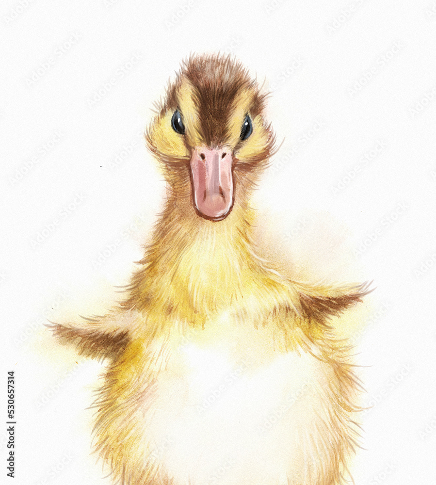 Fényképezés Watercolor illustration of a small fluffy duck chick, duckling, gosling on a whi