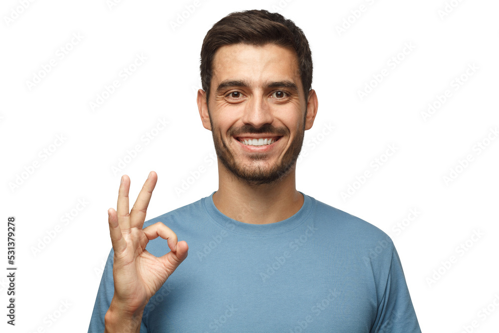 Fényképezés Young smiling man having happy look, gesturing, showing OK sign or showing okay