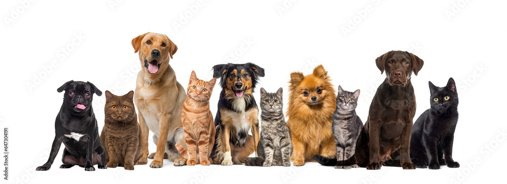 Fényképezés Group of pets, cats and dogs sitting in a raw and looking at the camera, isolate