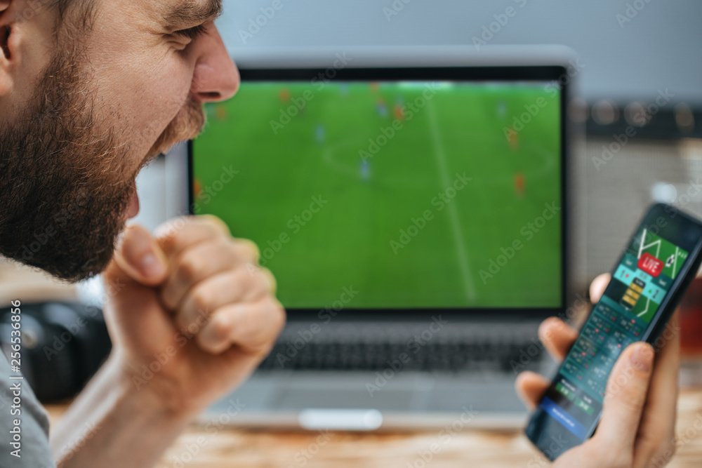Fényképezés Man celebrating victory after making bets at bookmaker website