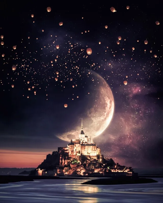 Vászonkép Mont Saint-Michel, Moon and Chinese Lanterns