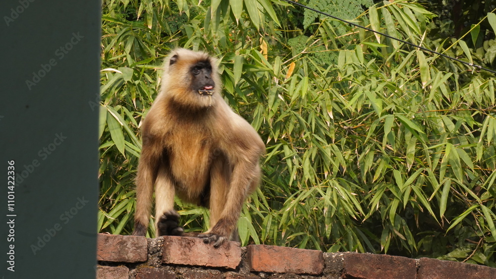 Matrica A solitary langur monkey sits peacefully on a terrace, delicately eating, its long tail curled and expressive eyes alert
