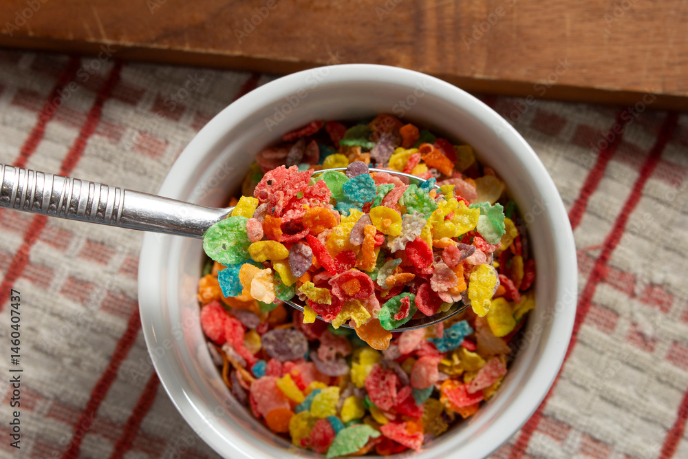 Matrica A top down view of a spoon scooping some popular rainbow flakes cereal