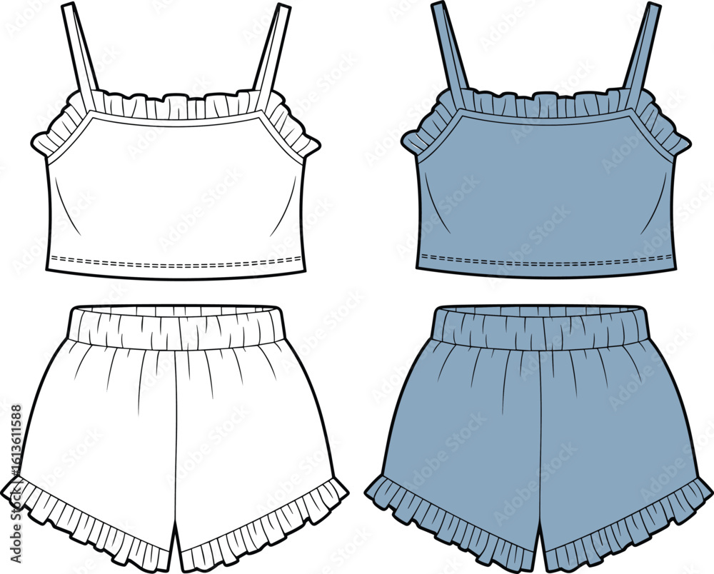 Matrica Women’s ruffle trim camisole and shorts set, sleepwear flat sketch, front and ba