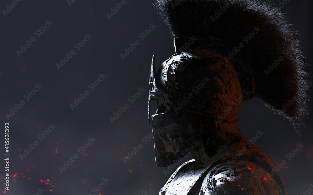 Matrica 3d render illustration of stone spartan warrior in helmet statue on dark background