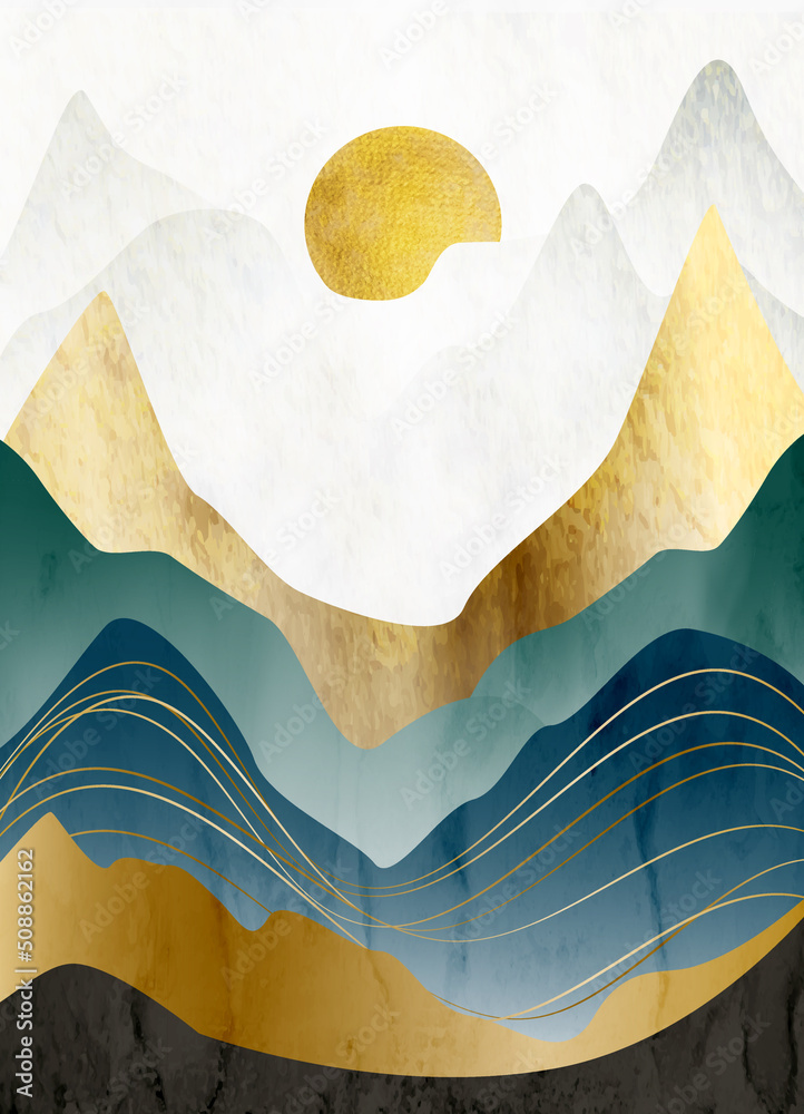 Matrica Abstract ink art background with mountains and hills in blue and gold