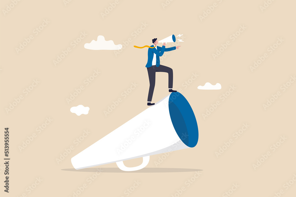 Matrica Leader communication, executive management skill to communicate with employee, send important message or announcement concept, businessman leader standing on big megaphone giving speech to public