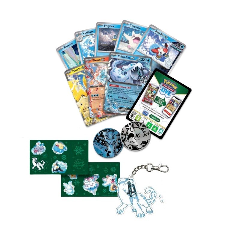 Pokémon TCG adventi naptár az ünnepi visszaszámláláshoz. 25 ablak tele kártyákkal és kiegészítőkkel az edzőknek — foil promókártyáktól és boosterektől a Chien-Pao kulcstartóig. Hivatalosan engedélyezett termék.