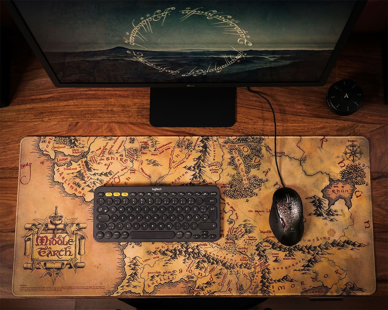 Egérpad részletes Középfölde-térképpel, amely lefedi az egész asztalt. A sűrű textilfelület pontos és kényelmes egérirányítást biztosít. Vízálló, megerősített szélekkel és csúszásgátló gumialappal, hogy mindig stabilan maradjon.