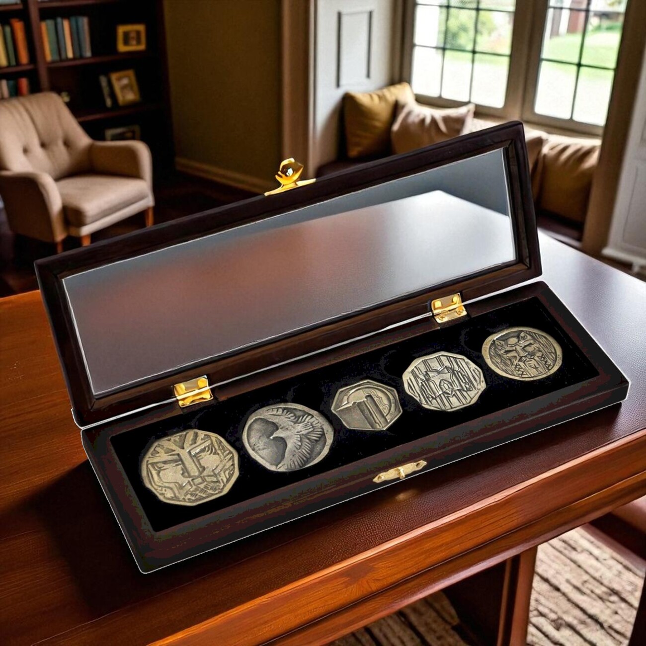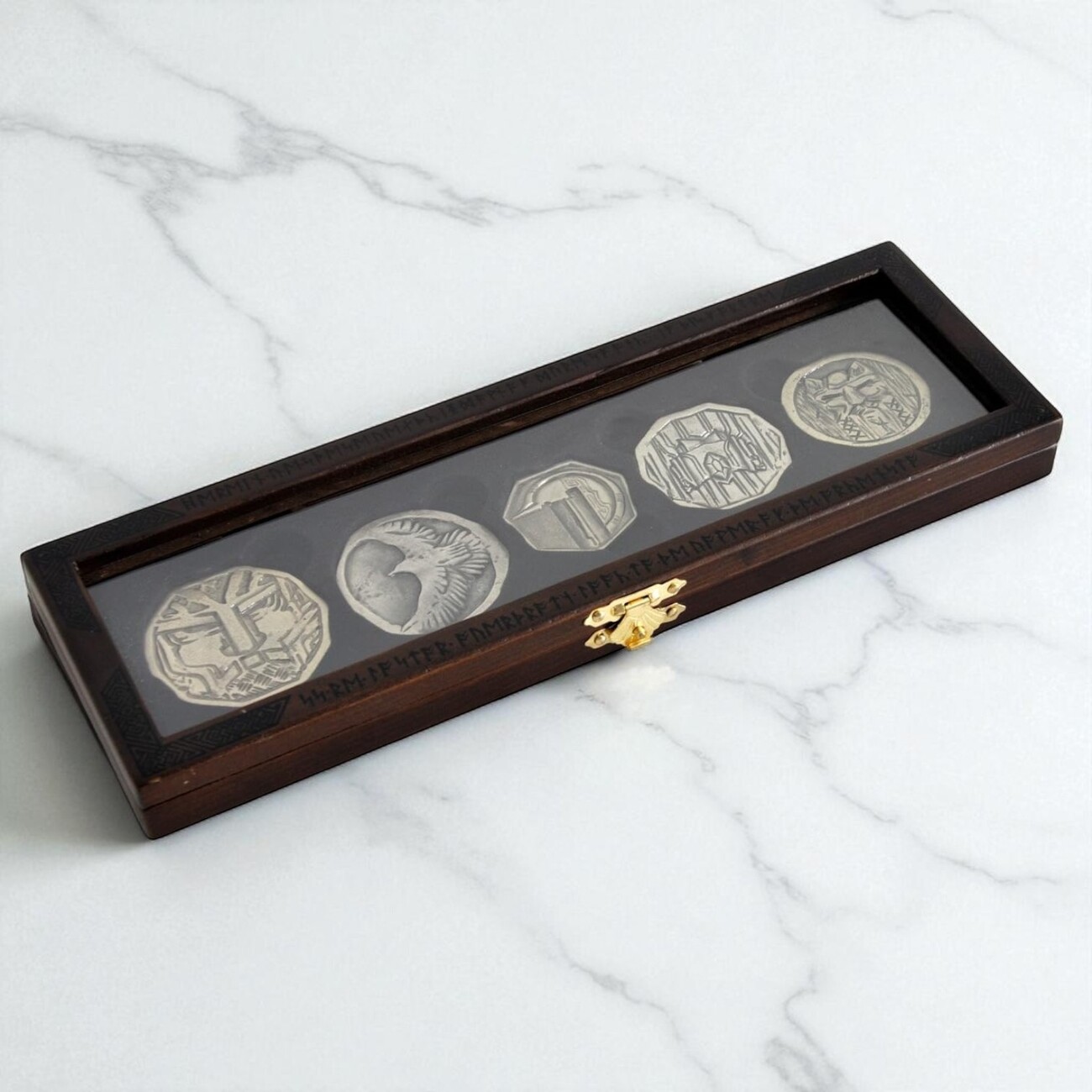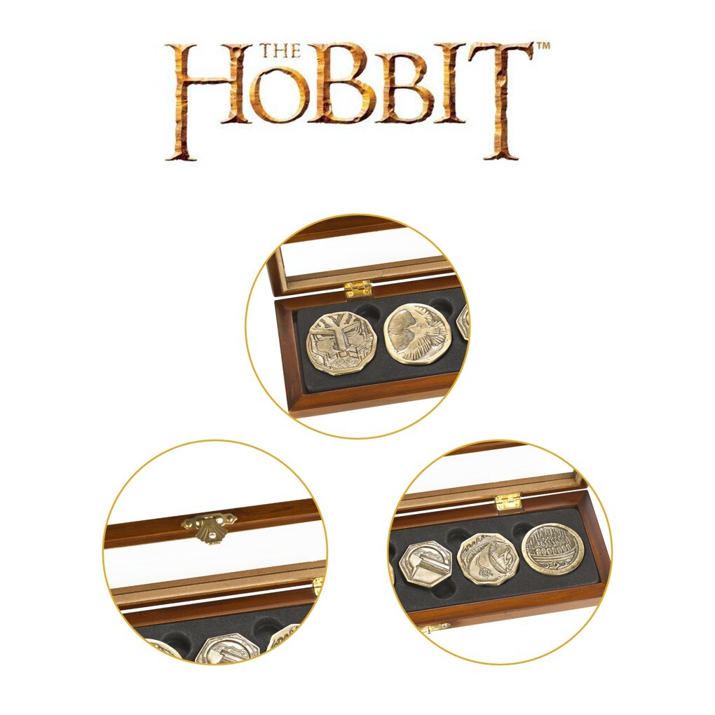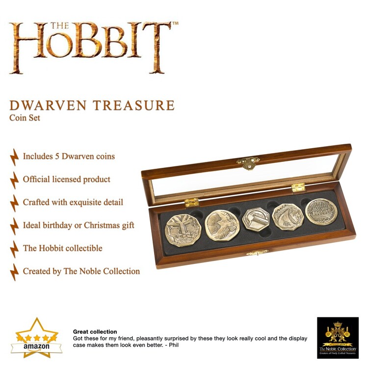 Szerezd meg a legendás törpkincs egy darabját a Magányos Hegyről! A szett 5 részletesen kidolgozott, bronzbevonatú érmét tartalmaz, elegáns fa dobozban. A csomag teljes mérete kb. 31 × 13 × 6 cm, súlya 330 g.