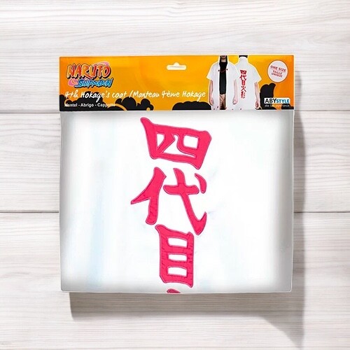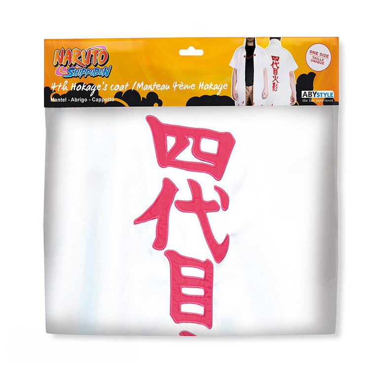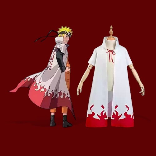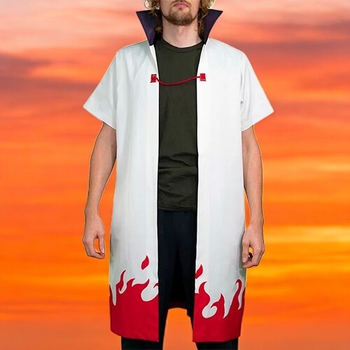 Minato Namikaze kabátjának luxus replikája univerzális felnőtt méretben 100% poliészterből készült, kiváló minőségű hímzéssel a betűk körül, precíz nyomtatással készült lángmintával és lila belső béléssel.