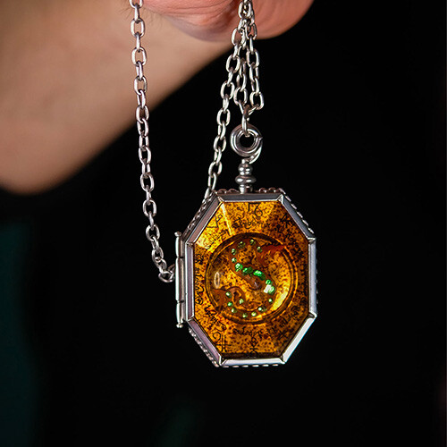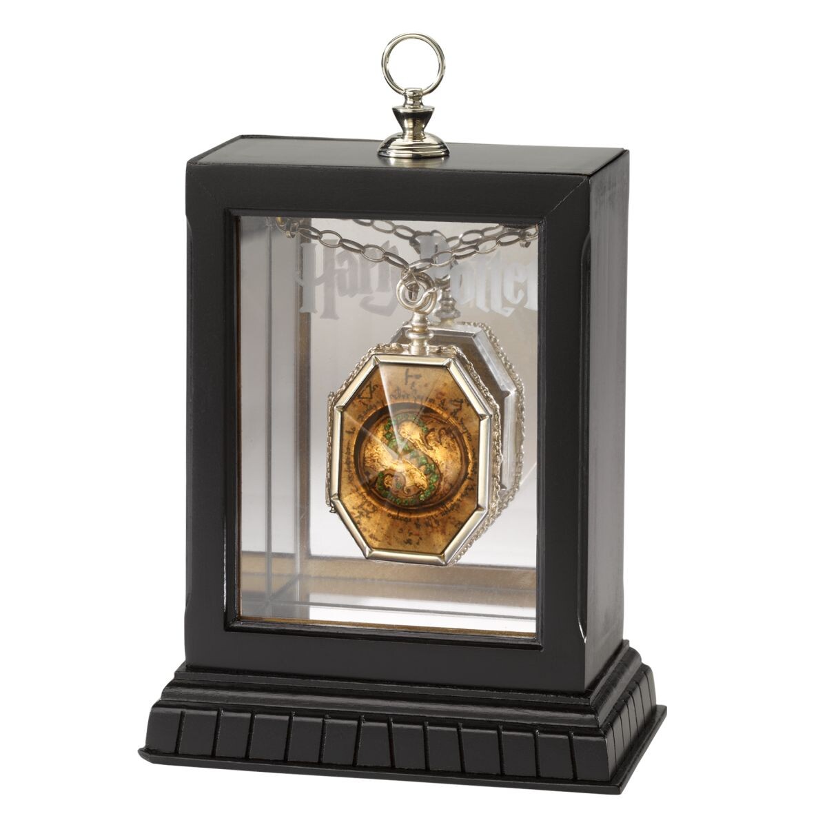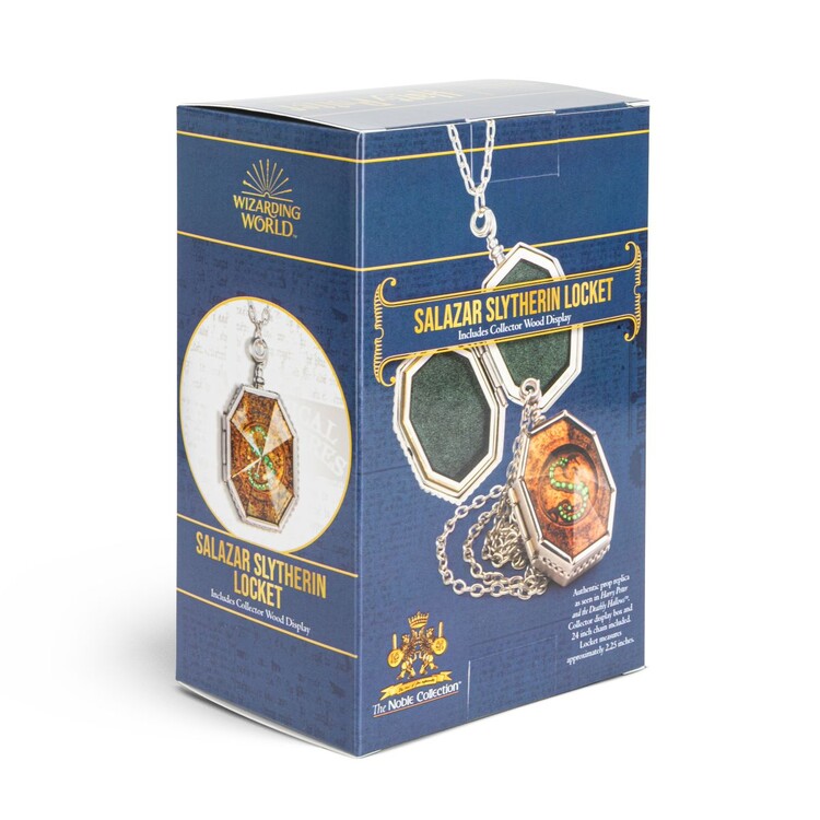 A Harry Potter filmsorozatból ismert Salazar Slytherin medál luxus másolata ezüstözött sárgarézből készült. A medál kinyitható, 60 cm-es lánccal és egy fényűző, fából készült vitrinben kerül forgalomba.